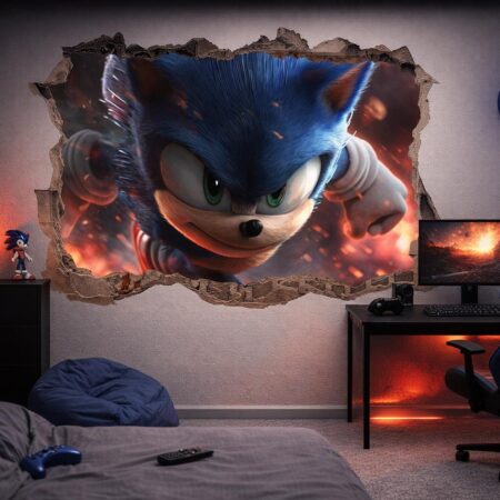 Bring the thrill of the chase into your child’s room with this hyper-realistic 3D wall decal. Featuring the world’s most famous blue speedster bursting through a smashed concrete wall, this mural captures the energy and excitement of his latest movie adventures. It is the perfect centerpiece for a gaming setup, a boy’s bedroom, or any fan’s collection.