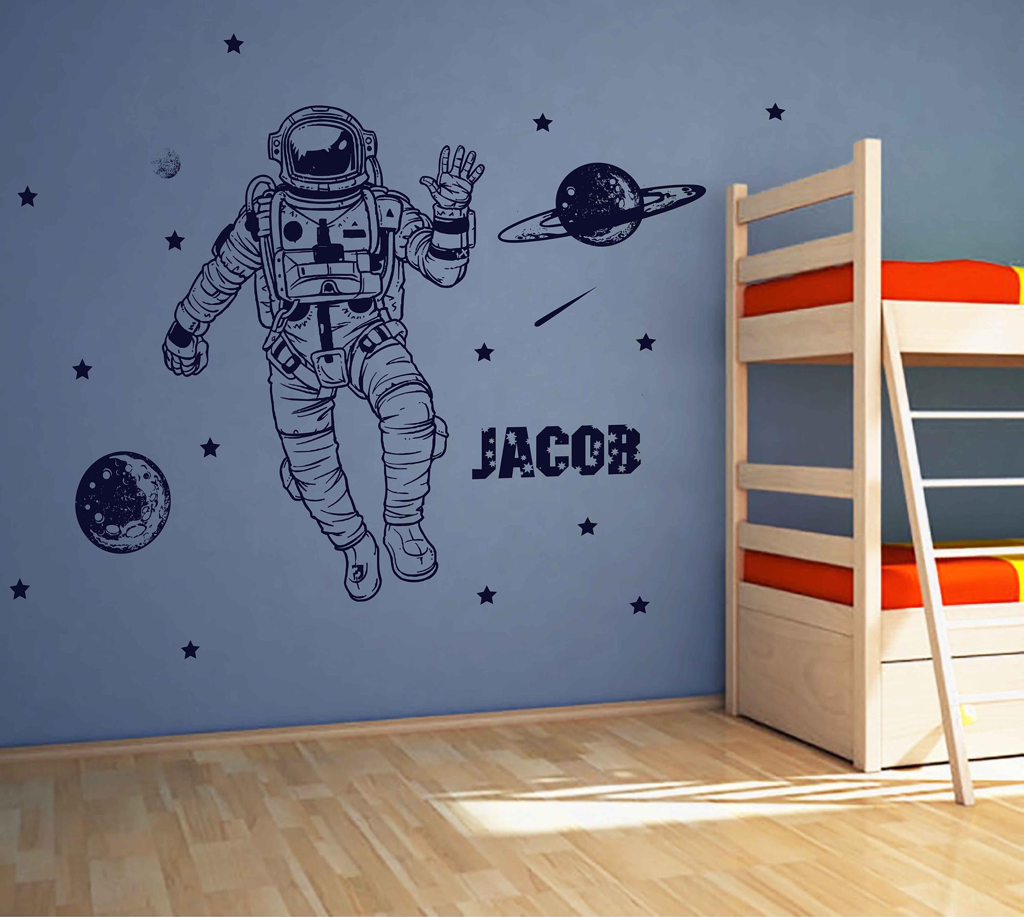 Peel and stick astronaut wall decal with custom name – personalized space vinyl sticker for nursery, kids room or playroom. This removable wall art with planets and stars is easy to apply and inspires imagination.