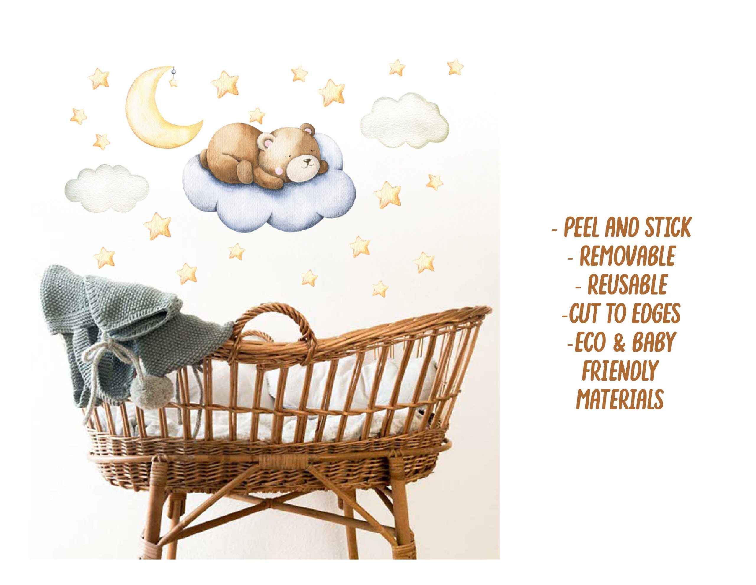Our bear nursery sleeping wall decals in vinyl are made with premium 3M and Oracal vinyl with a matte finish. They apply easily and remove cleanly without damaging your walls. Moreover, they work well on flat walls, slightly textured surfaces, doors, windows, and furniture.