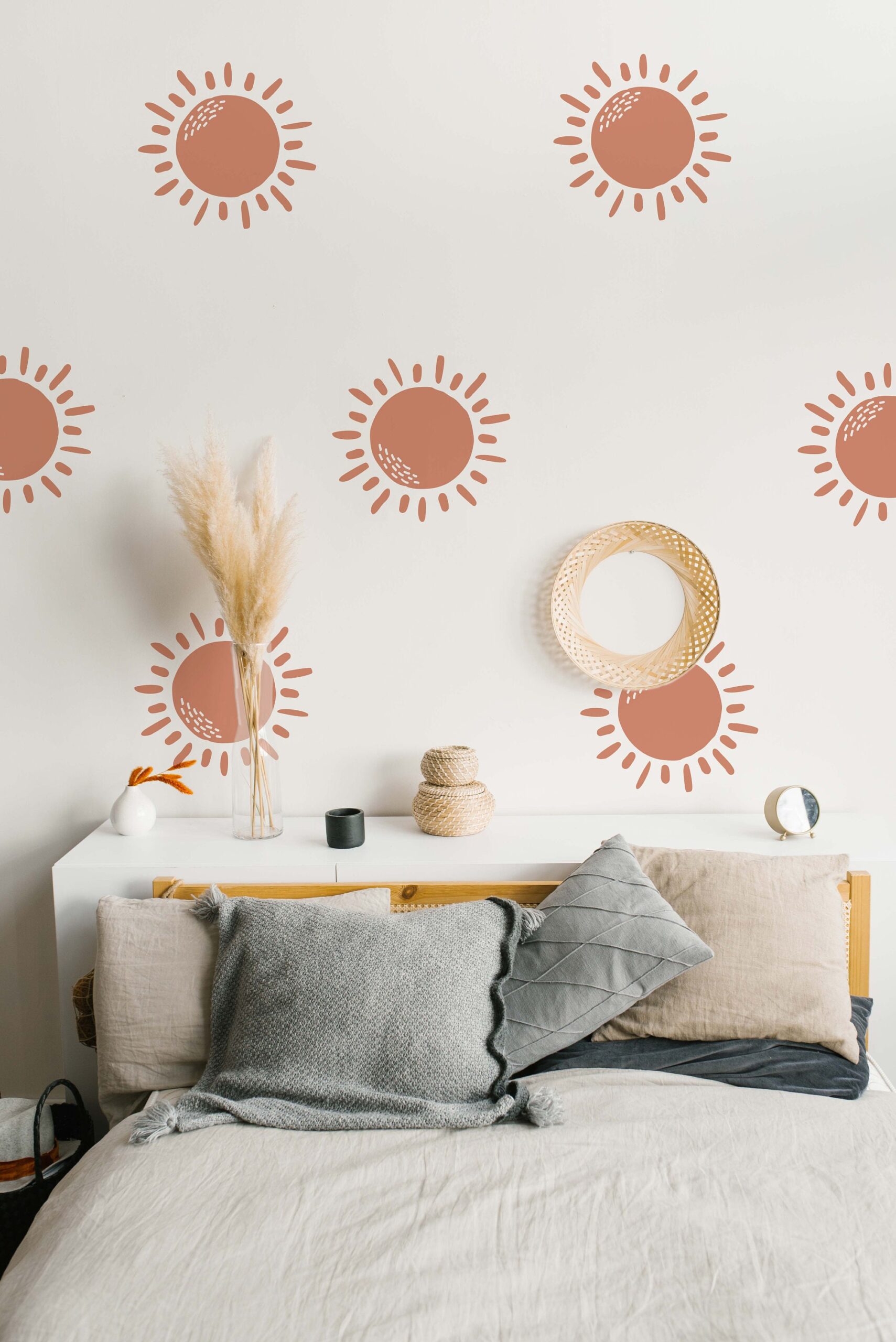 These boho sun nursery wall decals come in two set sizes — small and large. Therefore, you can choose the amount that best fits your wall space. Additionally, custom sizes are available on request.