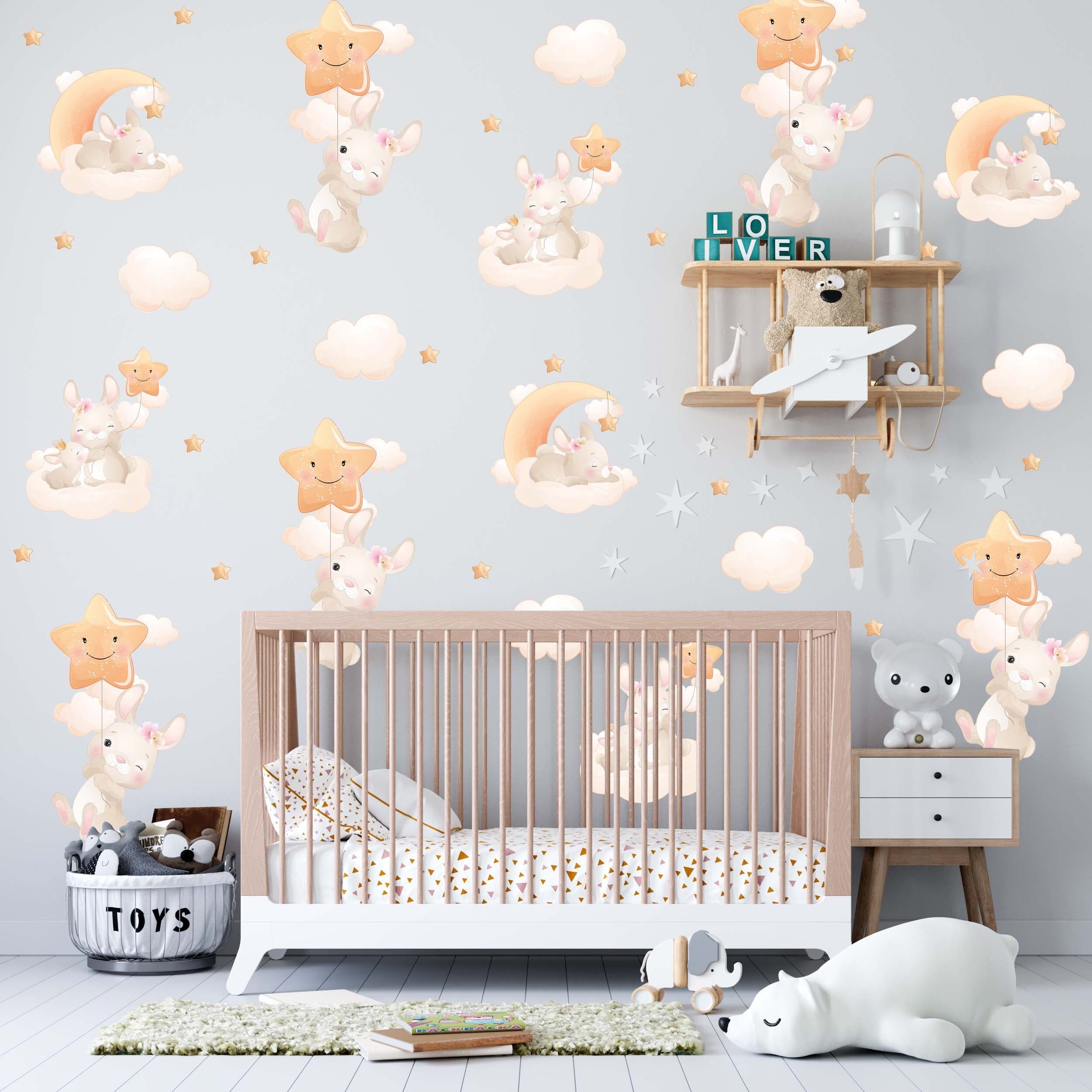 Cute Bunny & Clouds Wall Decals for Nurseries – Whimsical Moon & Stars Animal Stickers
