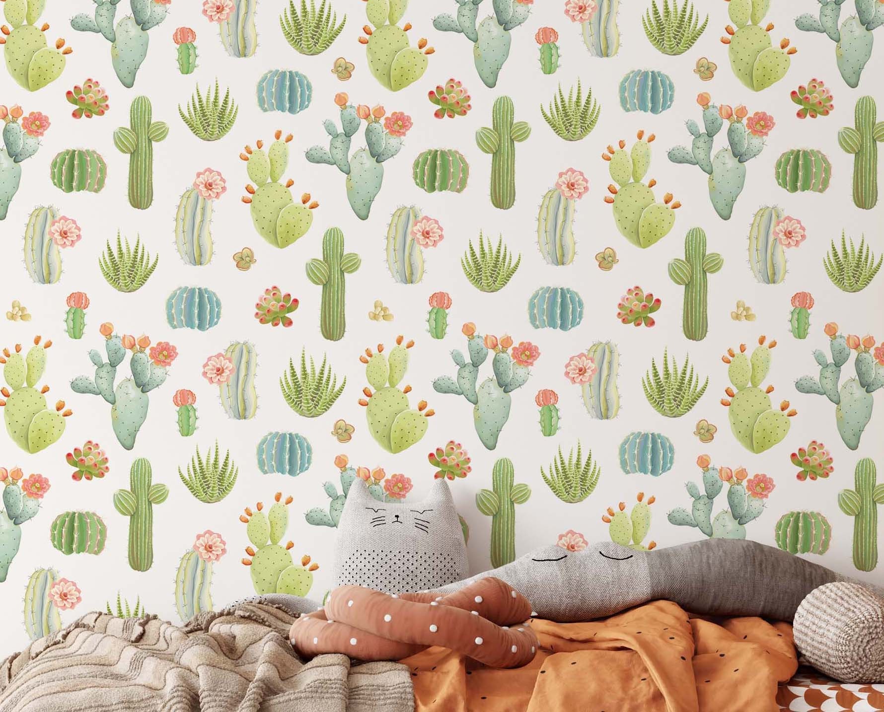 Cacti Wallpaper Scandinavian Light Green Peel and Stick Cactus Flowers Removable Self Adhesive Botanical Mural Home Decor Wall Art, NW32