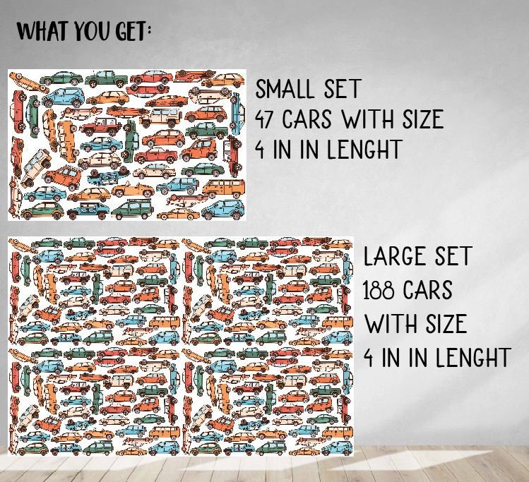 These car car style wall decals come in two set sizes — small and large. Therefore, you can choose the amount that best fits your wall space. Additionally, custom sizes are available on request.