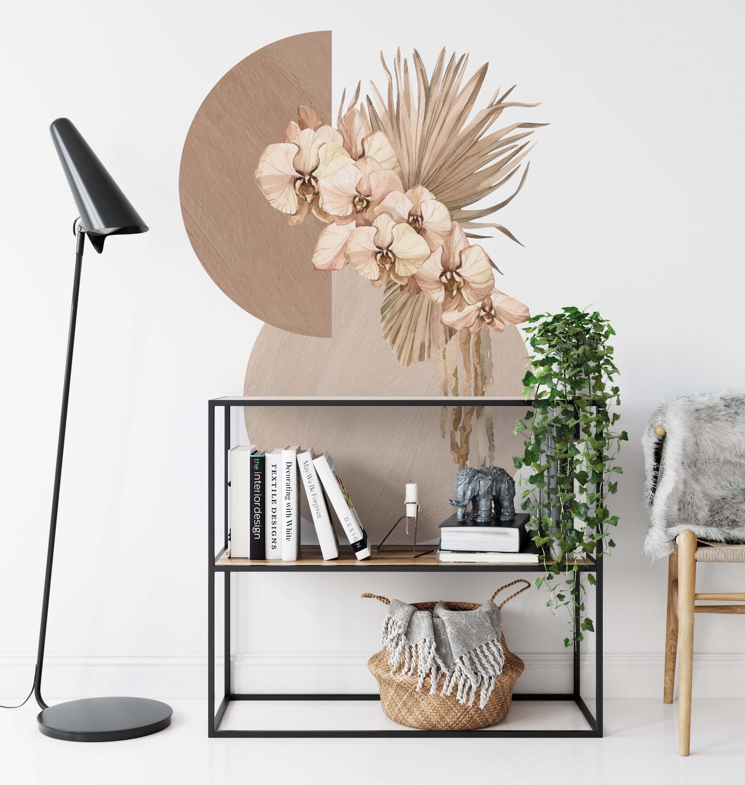 Circle Wall Decal Palm Leaves Color Block Flowers Orchid Boho Modern Sticker Headboard Large, Eclectic Style LF381