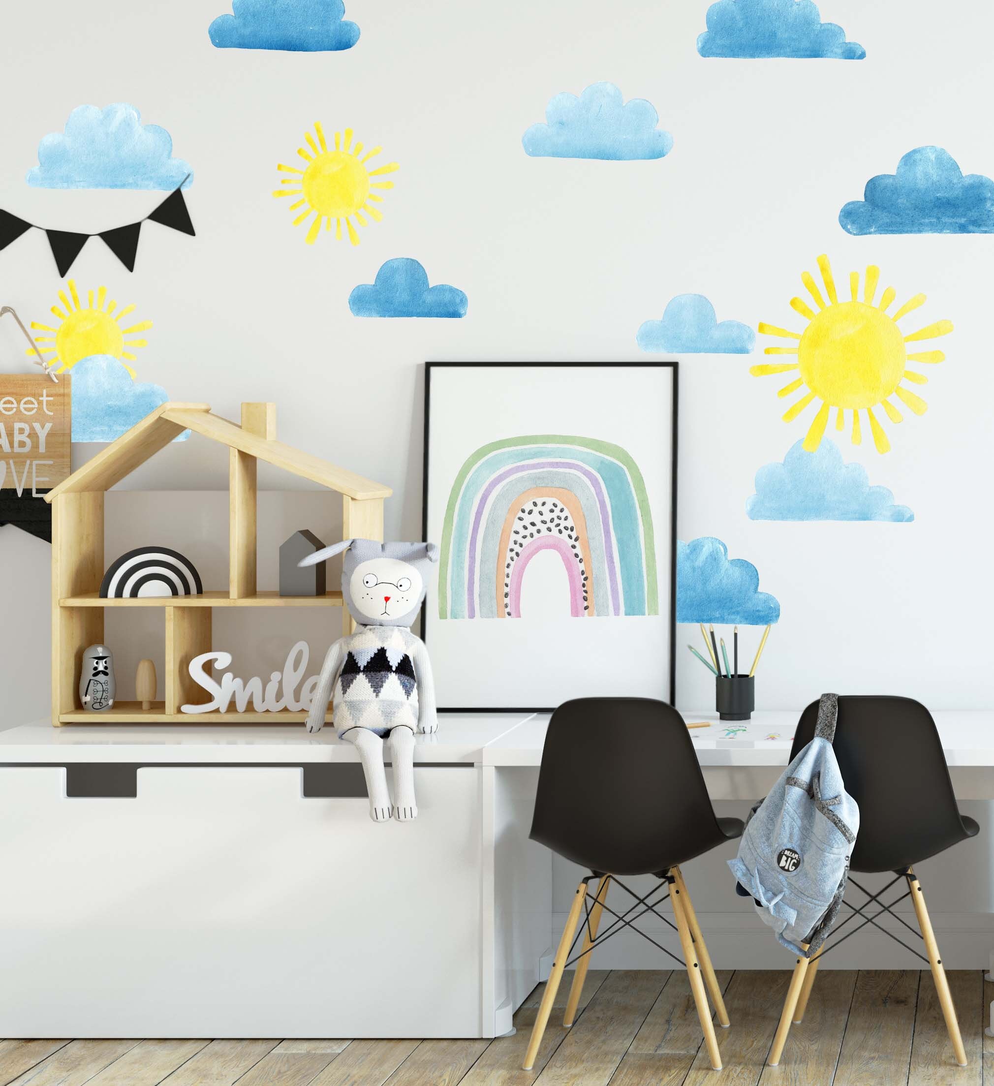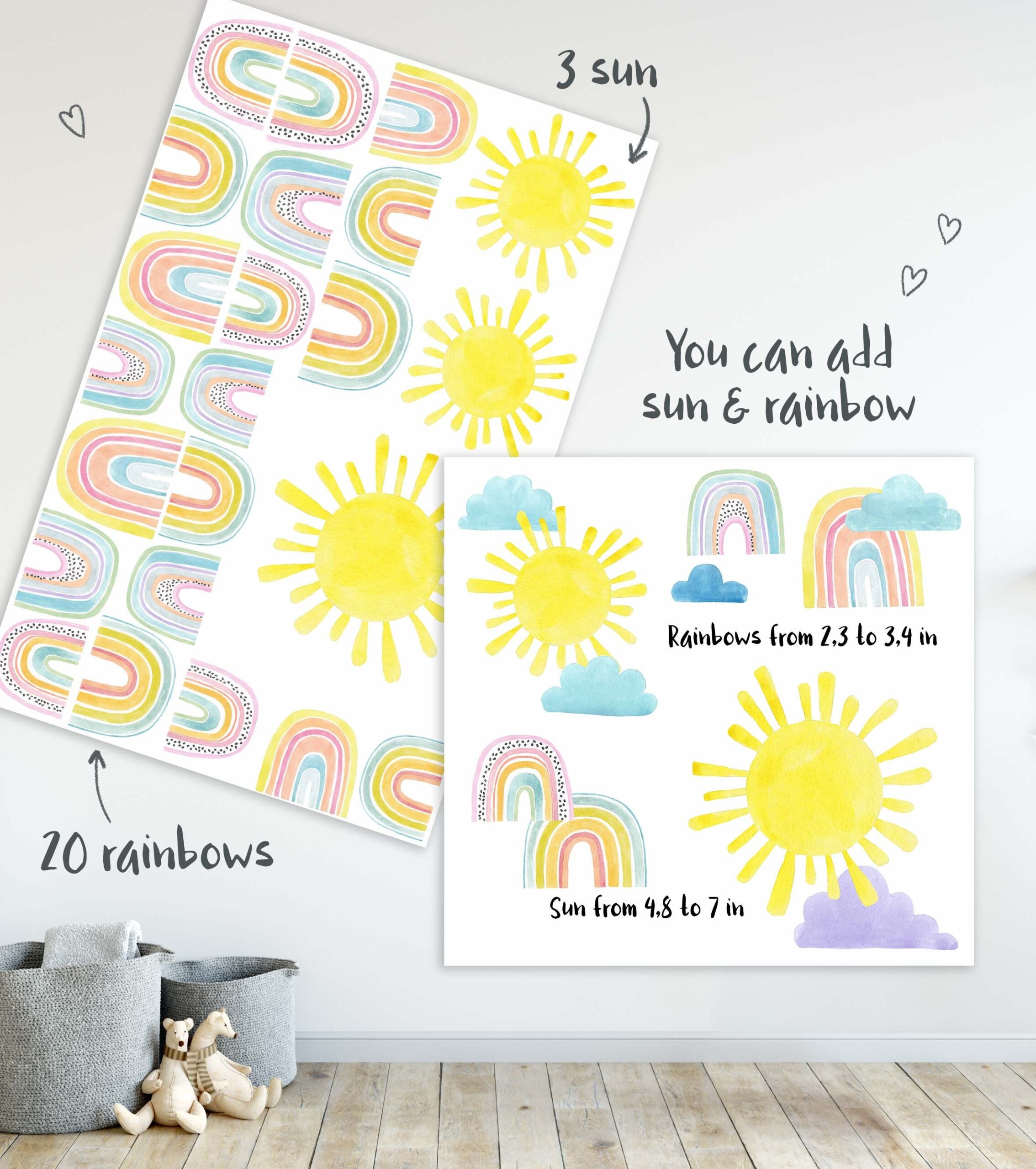 🌈 Discover our clouds rainbow sun wall decals — a beautiful design that instantly elevates any room. Furthermore, each individual piece can be placed wherever you like, so you can create a truly unique arrangement.