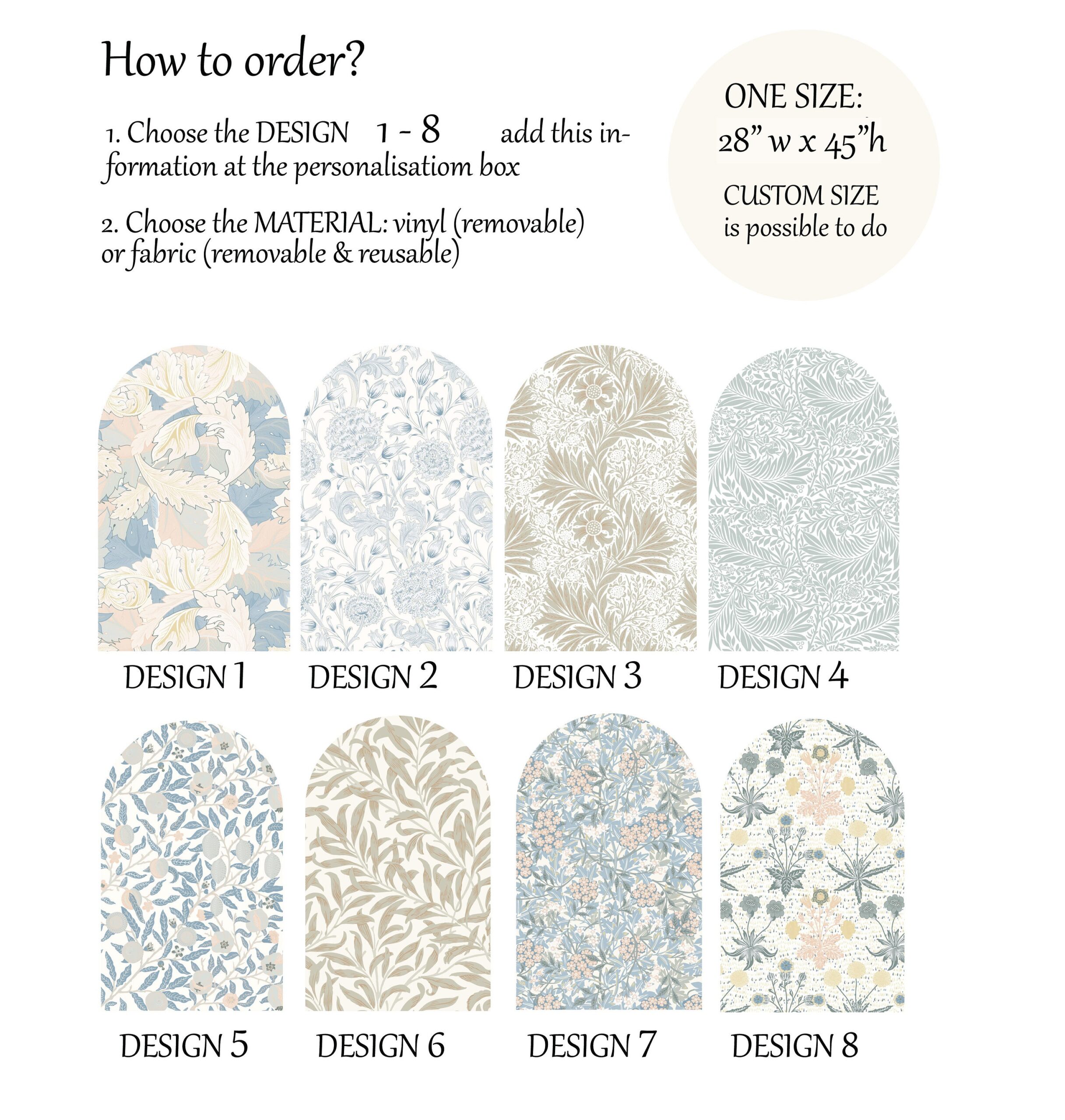 Our floral arch beige wall decals in vinyl are made with premium 3M and Oracal vinyl with a matte finish. They apply easily and remove cleanly without damaging your walls. Moreover, they work well on flat walls, slightly textured surfaces, doors, windows, and furniture.