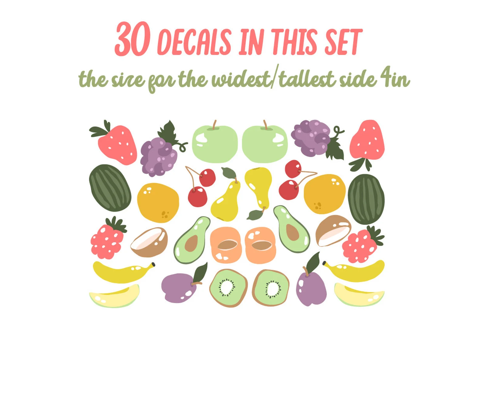 - A full sheet of your chosen fruit decals 30 decals in this set with different size