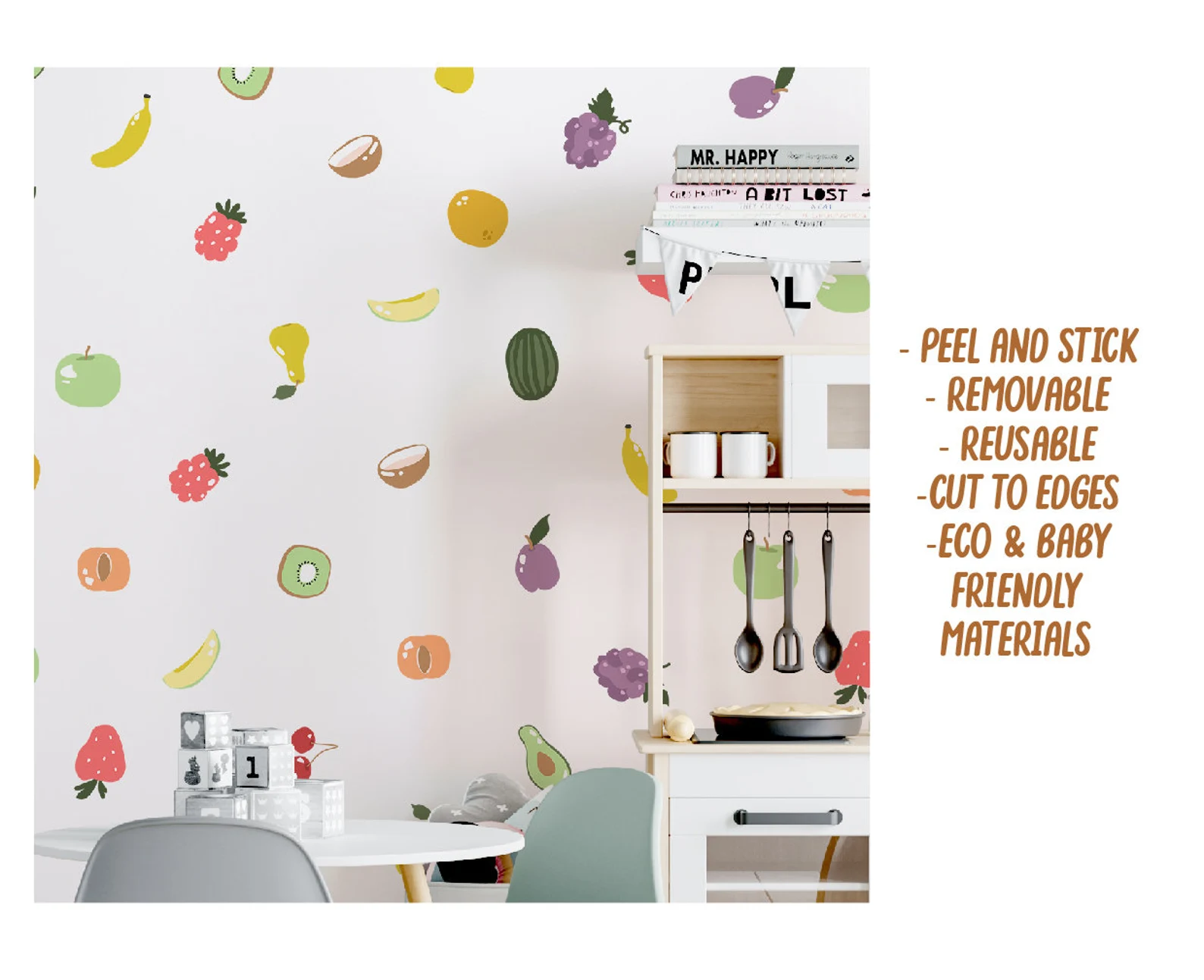 Ultimately, these decals offer a creative and commitment-free way to personalize your space. Order a set today and start designing your fun, fruity wall!