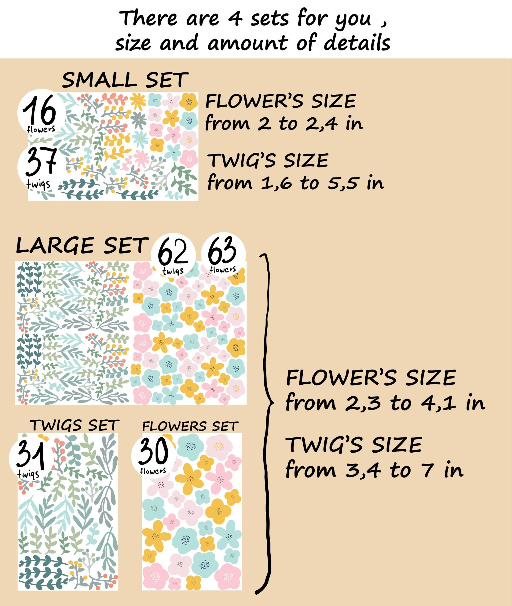 These greenery flowers nursery wall decals come in two set sizes — small and large. Therefore, you can choose the amount that best fits your wall space. Additionally, custom sizes are available on request.