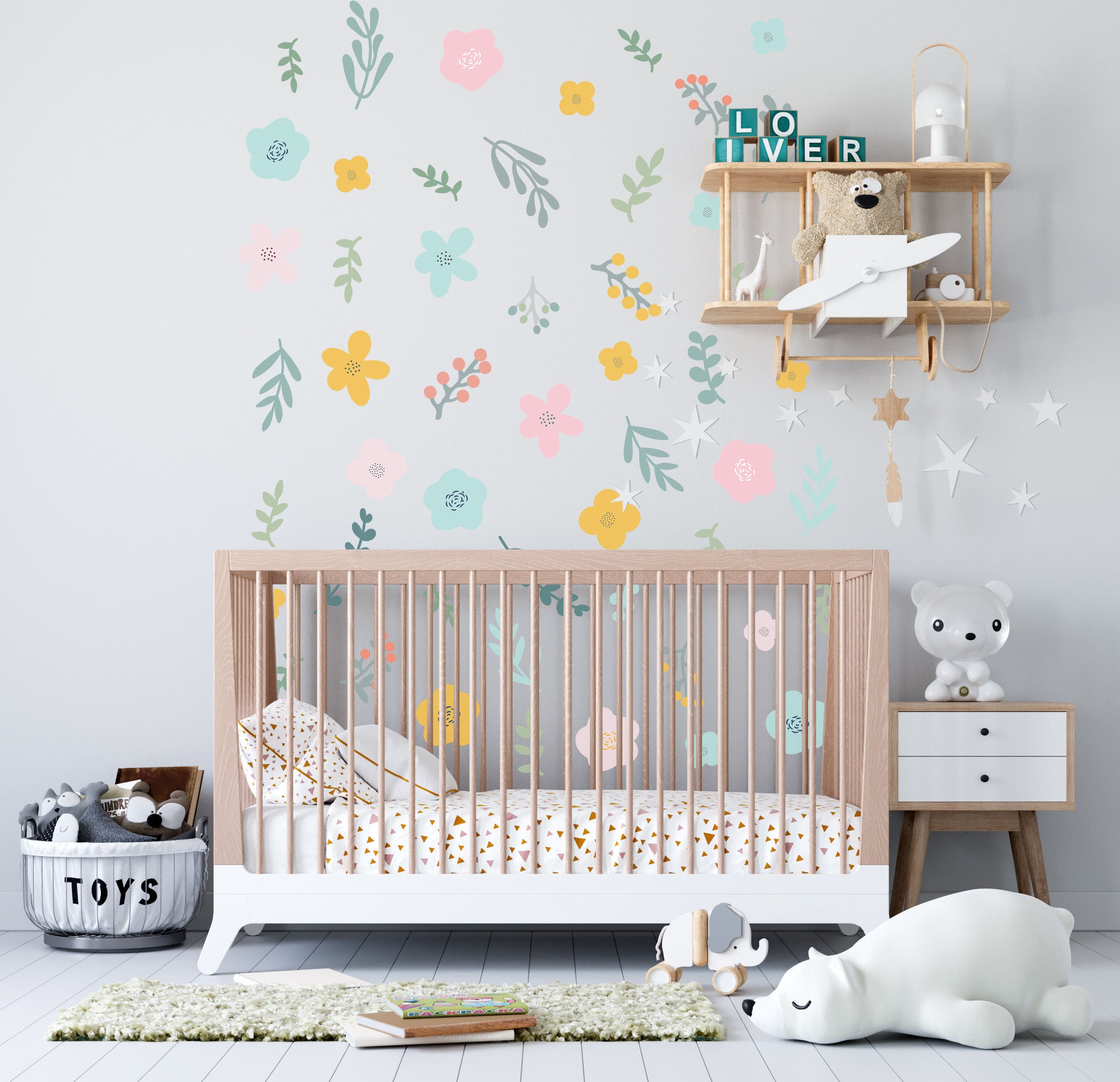👶 Discover our greenery flowers nursery wall decals — a beautiful design that instantly elevates any room. Furthermore, each individual piece can be placed wherever you like, so you can create a truly unique arrangement.