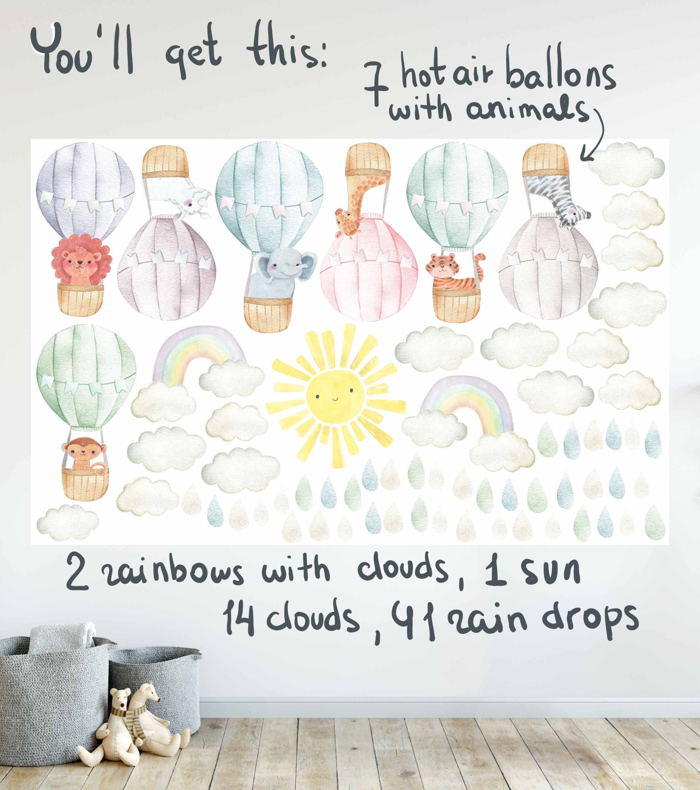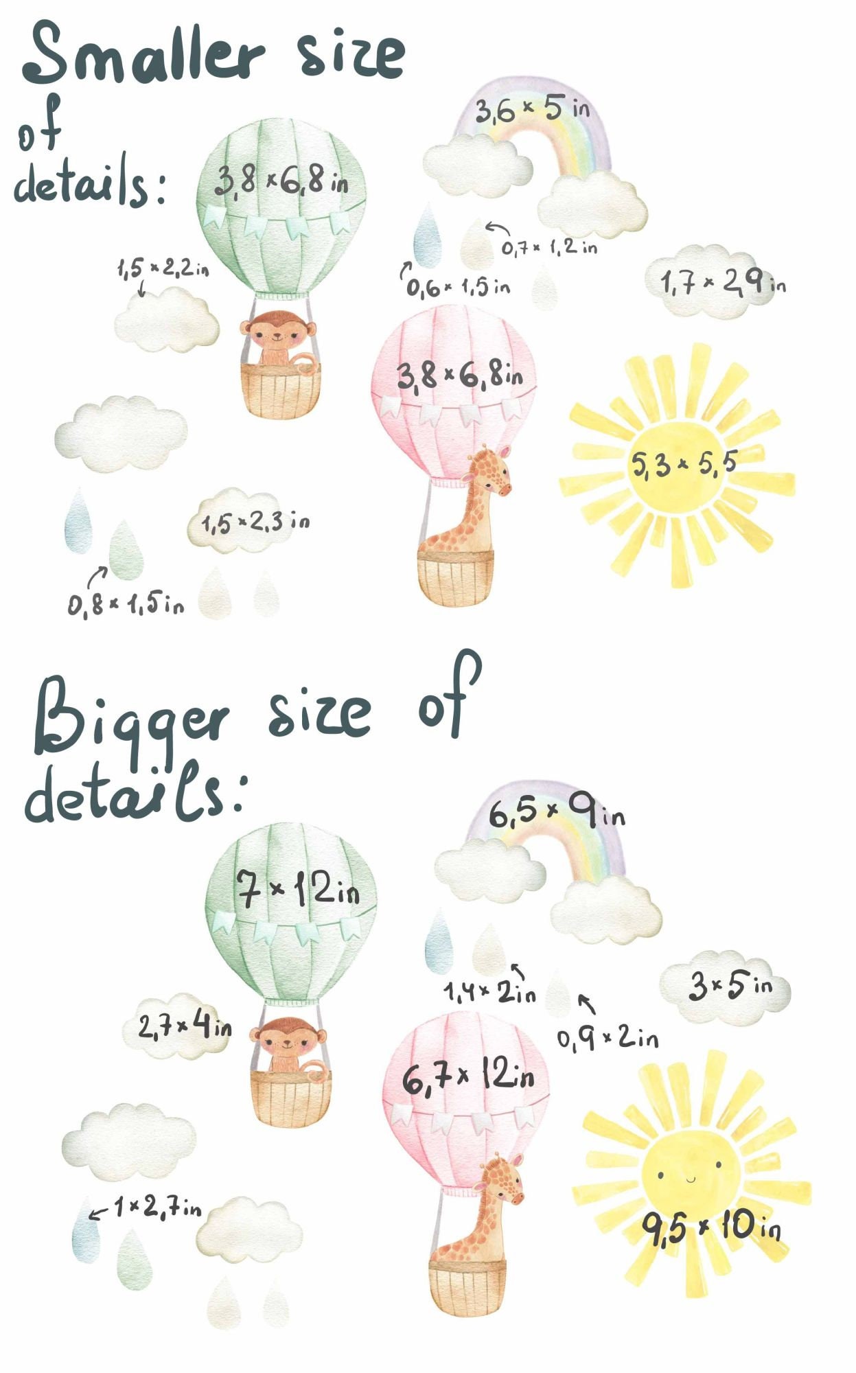 ♥ DETAILS:7 Balloons with Giraffe, Elephant, Zebra, Tiger, Lion, Rhino and Monkey :SMALL size is 3,8×6,8 in (9,5×17 cm),BIG size is 7×12 in (18×30 cm)14 Clouds :SMALL size is 1,5×2,9 in (3,8×7 cm),BIG size is 2,7×5 in (7×12,5 cm)1 sun :SMALL size is 5,5 in (14 cm),BIG size is 10 in (25 cm)41 rain drops :SMALL size is 0,6×1,5 in (1,5×7 sm),BIG size is 1×2,7 in (2,5×7 sm)2 Rainbows with clouds :SMALL size is 3,6×5 in (9×12,5 sm),BIG size is 6,5×9 in (16,5×23 sm)