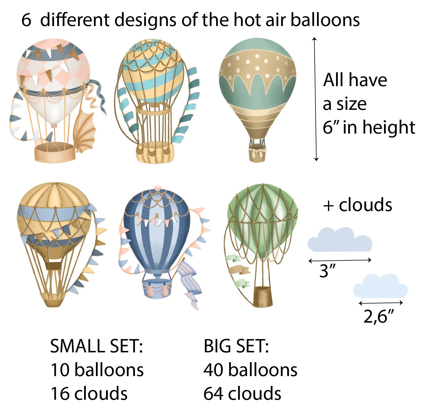 These hot air balloon wall decals come in two set sizes — small and large. Therefore, you can choose the amount that best fits your wall space. Additionally, custom sizes are available on request.