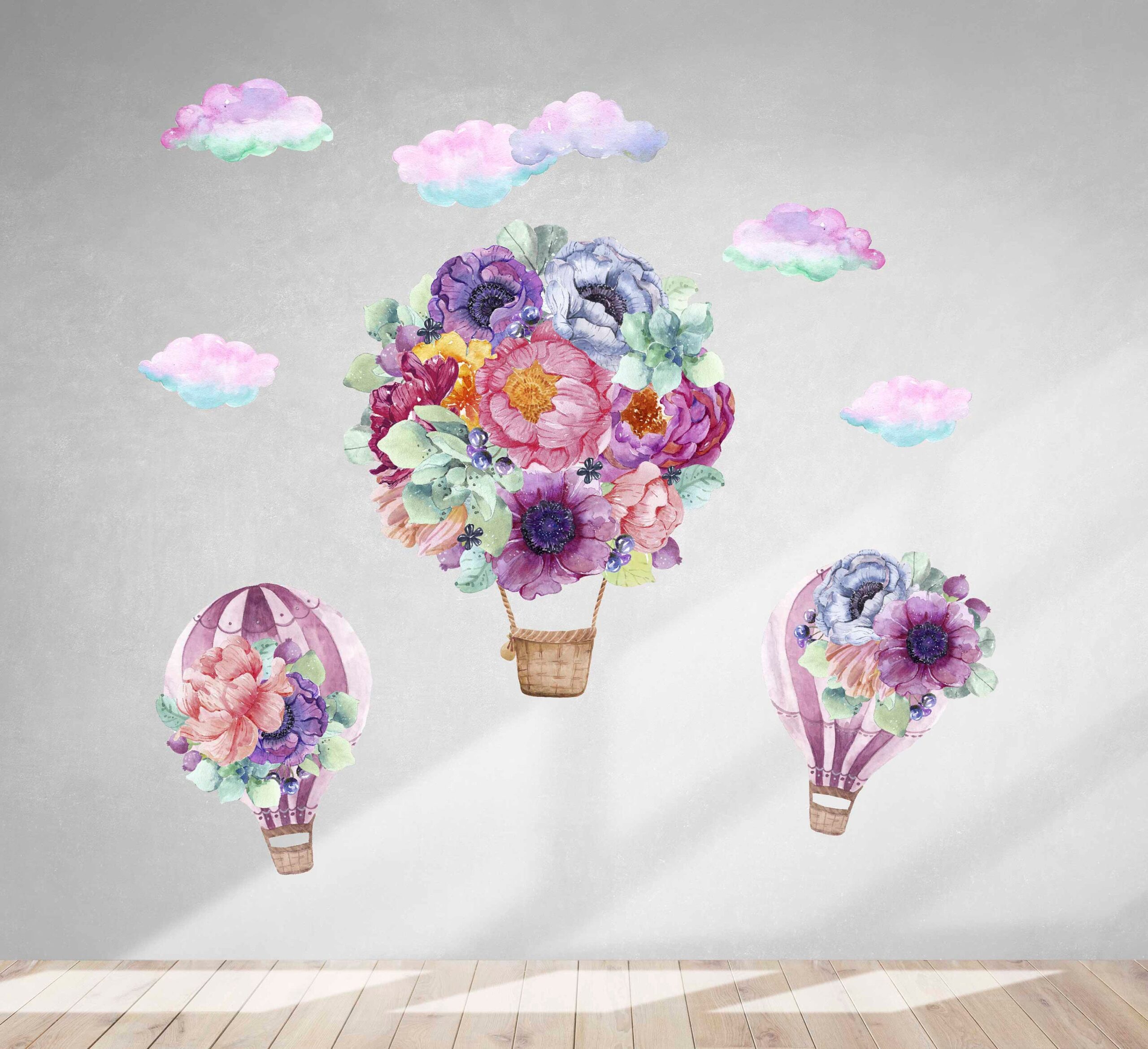 Hot Air Balloon Wall Decals | Watercolor Flower Nursery Decor | Removable Sky Theme Stickers | Baby Shower Gift | Renter Friendly Art LF118e