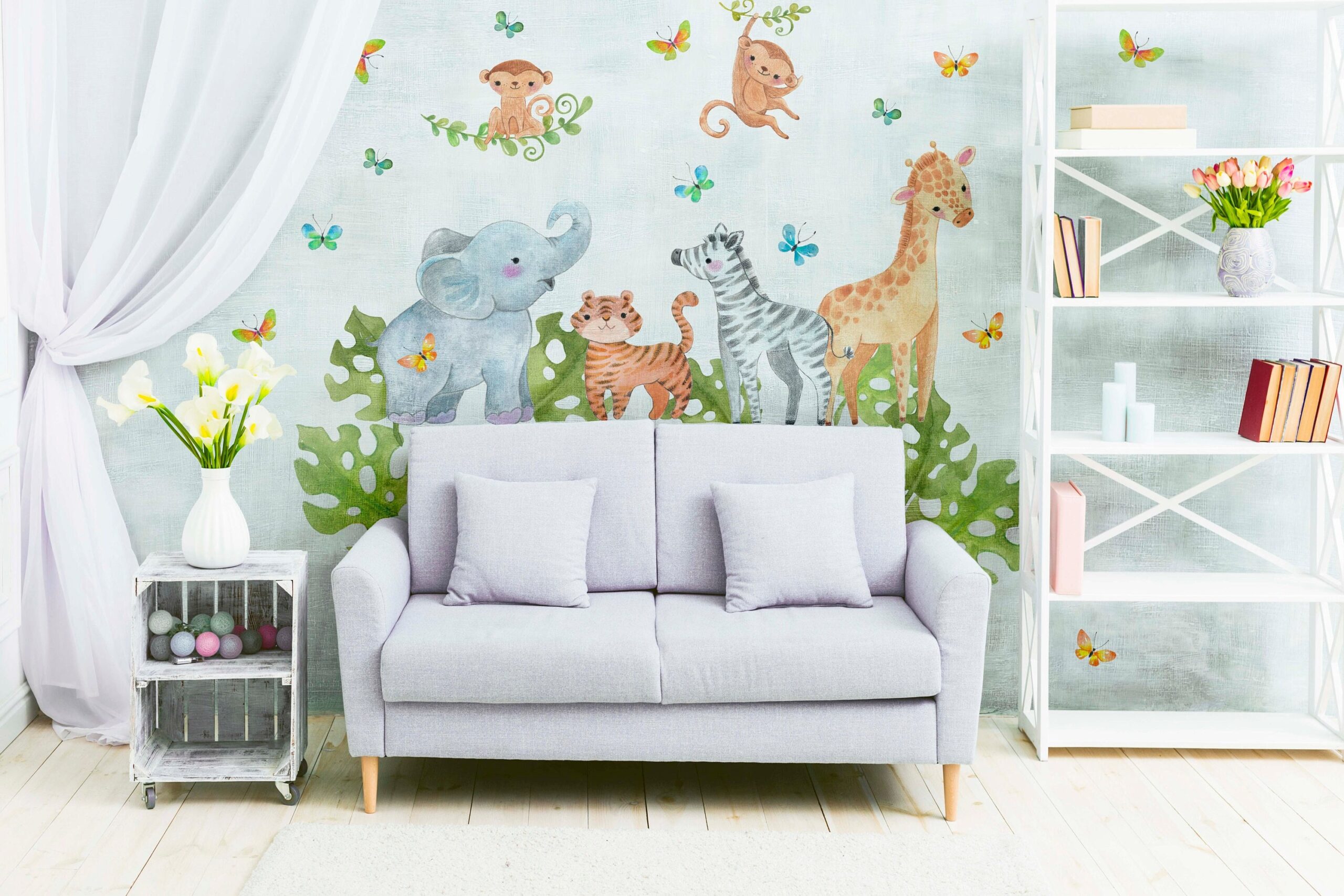 * 8 Decals with baby animals: Giraffe, Elephant, Zebra, Lion, Rhino, Monkey and Tiger