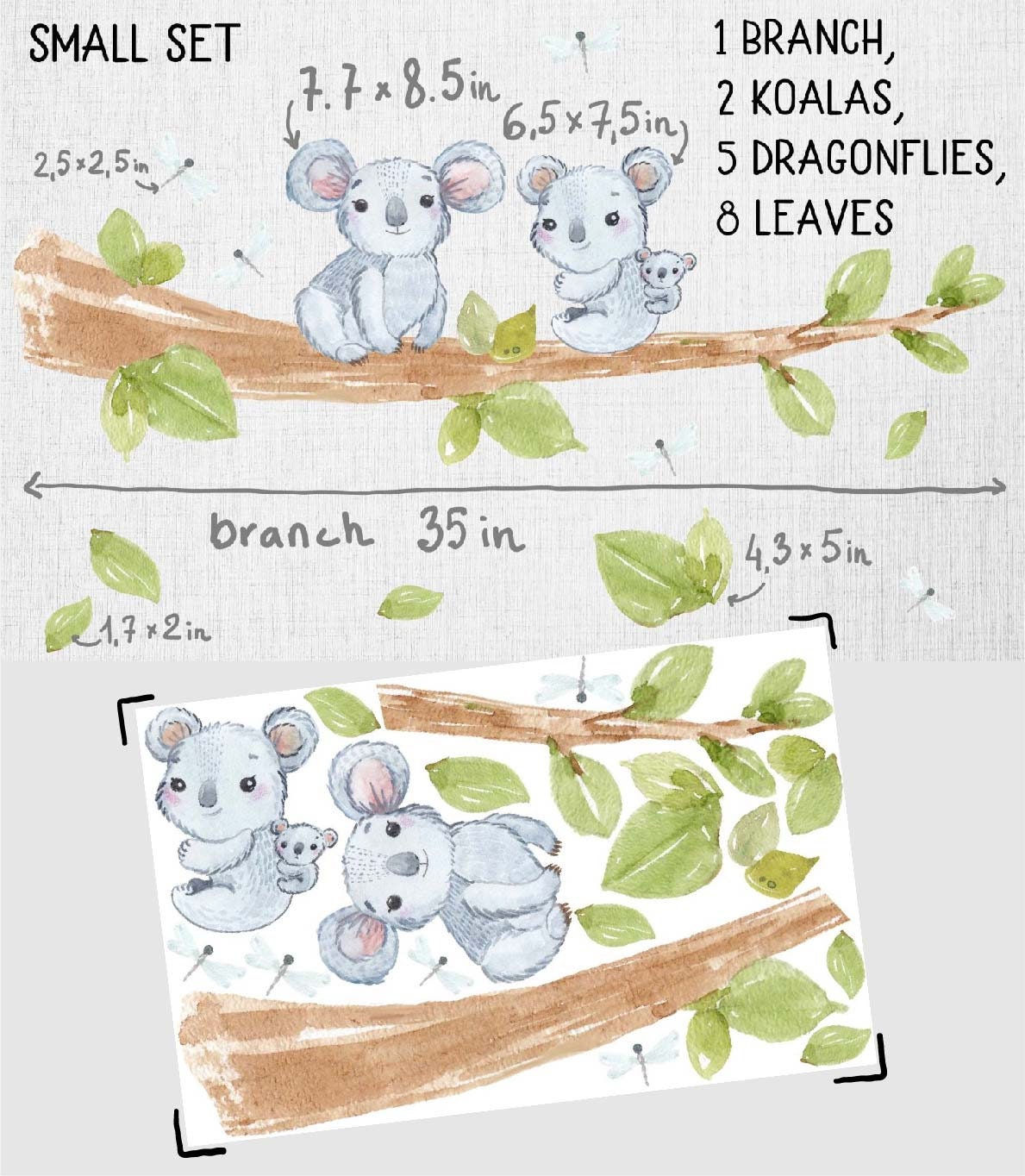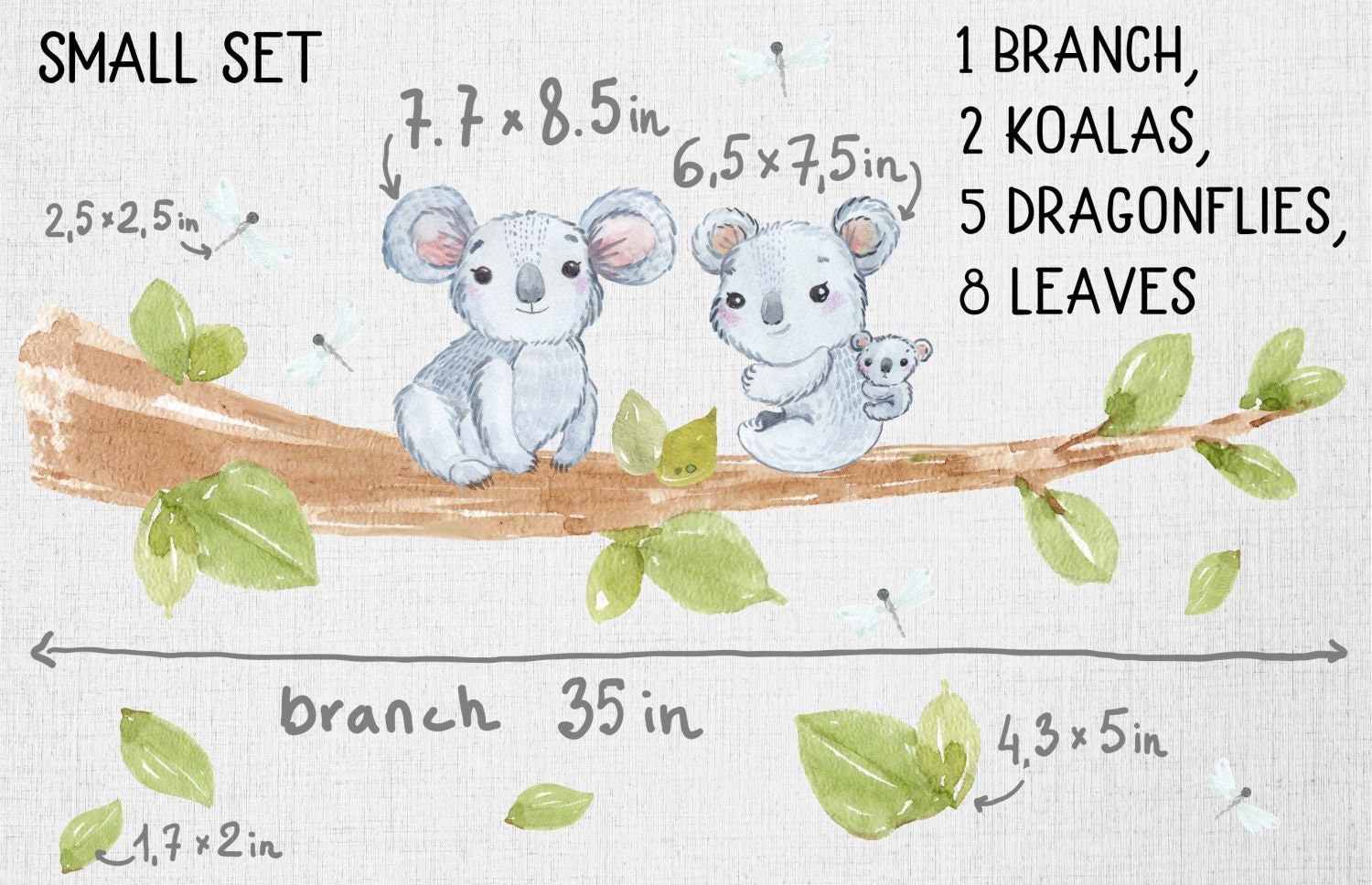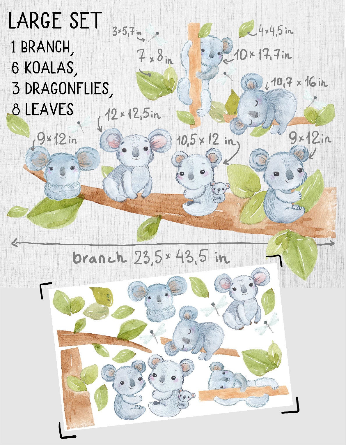 These koala tree greenery wall decals come in two set sizes — small and large. Therefore, you can choose the amount that best fits your wall space. Additionally, custom sizes are available on request.