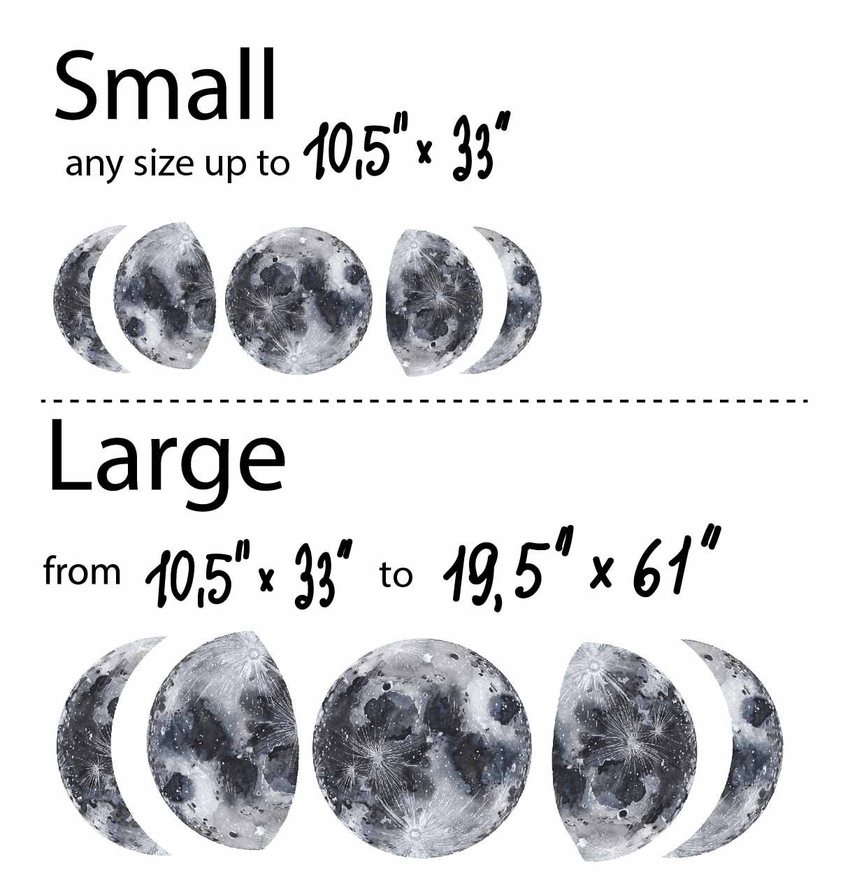 Our moon phases gray wall decals in vinyl are made with premium 3M and Oracal vinyl with a matte finish. They apply easily and remove cleanly without damaging your walls. Moreover, they work well on flat walls, slightly textured surfaces, doors, windows, and furniture.