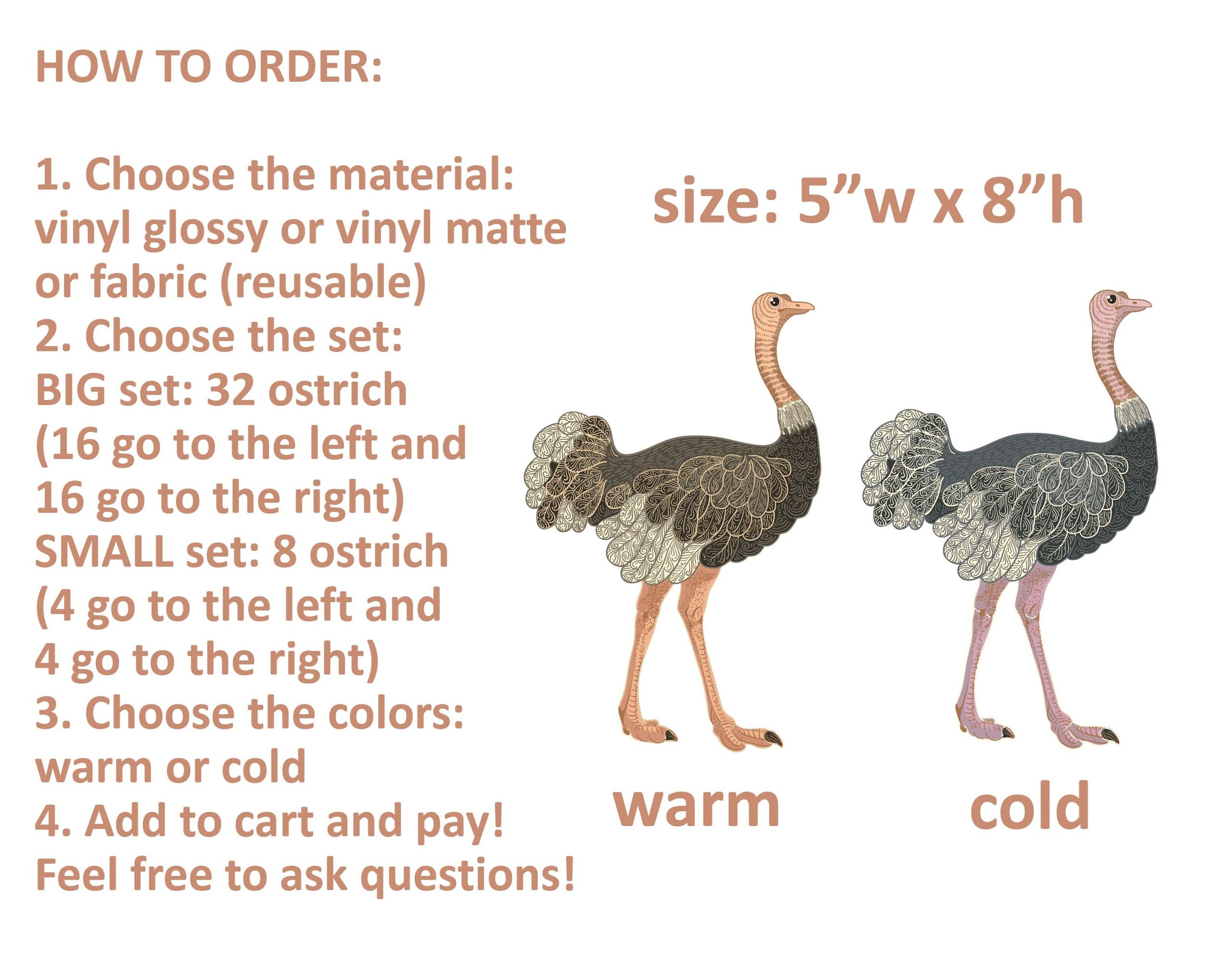 These ostrich safari bird wall decals come in two set sizes — small and large. Therefore, you can choose the amount that best fits your wall space. Additionally, custom sizes are available on request.