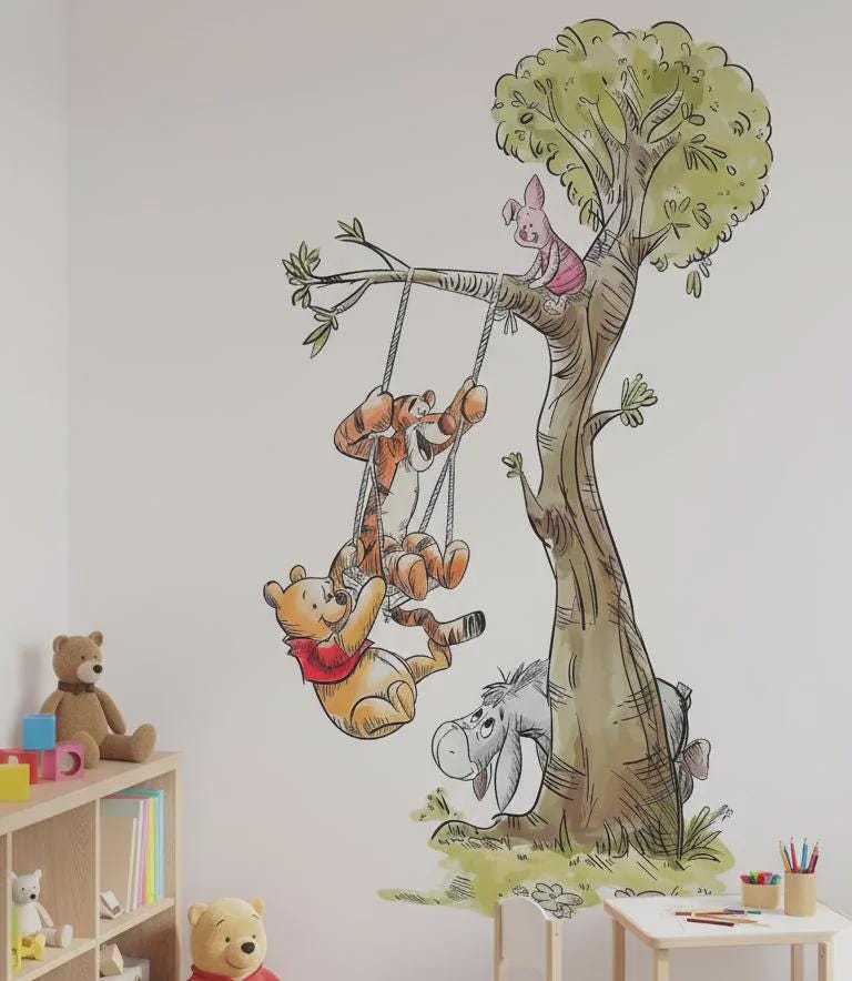 🐻 Peel and stick Winnie the Pooh wall decal – adorable nursery vinyl sticker featuring Pooh, Tigger, Piglet, and Eeyore. This removable wall art instantly transforms your child’s room, play area, or reading nook into a cozy storytime space.
