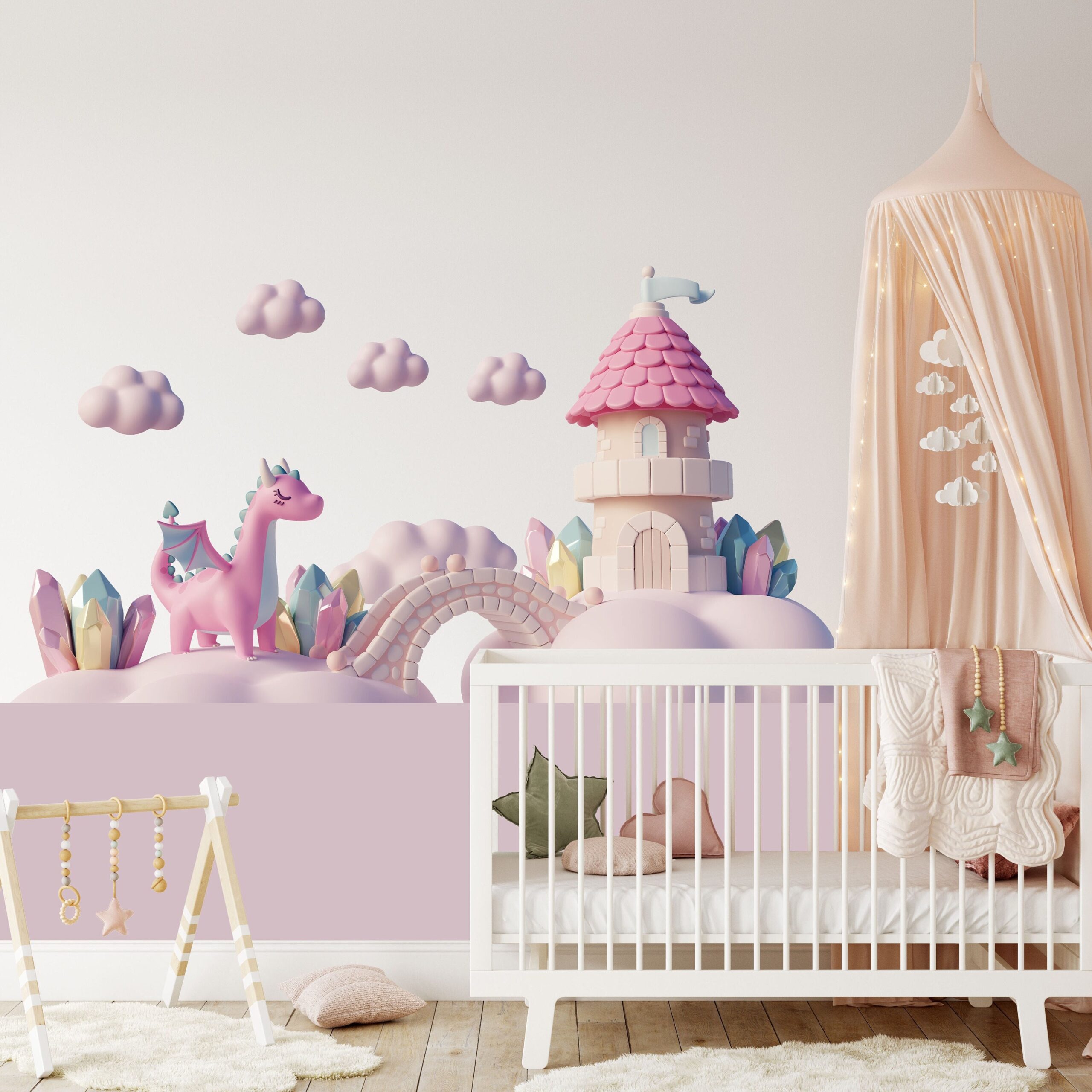 Pink Dragon Wall Stickers Castle Fairy tale Clouds Decals Girl’s Nursery Playroom Wall Decor