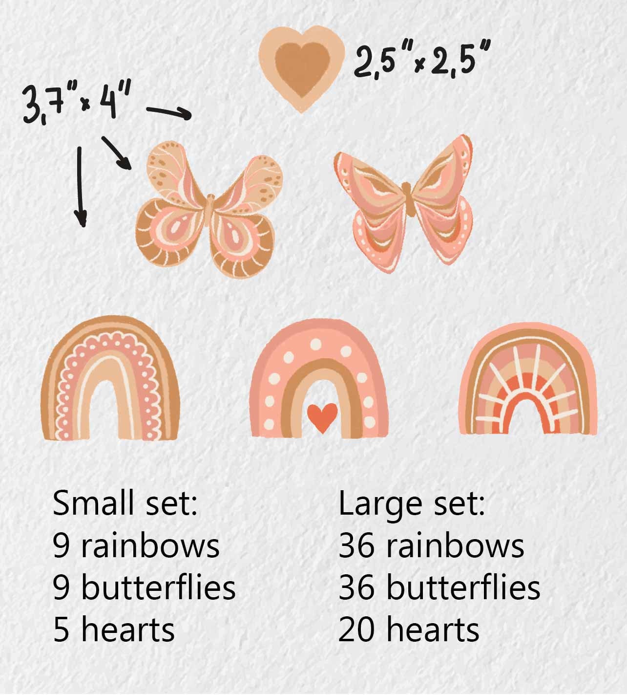 These rainbow butterfly nursery wall decals come in two set sizes — small and large. Therefore, you can choose the amount that best fits your wall space. Additionally, custom sizes are available on request.