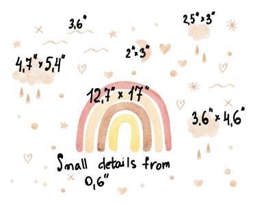 Our rainbow stars clouds wall decals in vinyl are made with premium 3M and Oracal vinyl with a matte finish. They apply easily and remove cleanly without damaging your walls. Moreover, they work well on flat walls, slightly textured surfaces, doors, windows, and furniture.