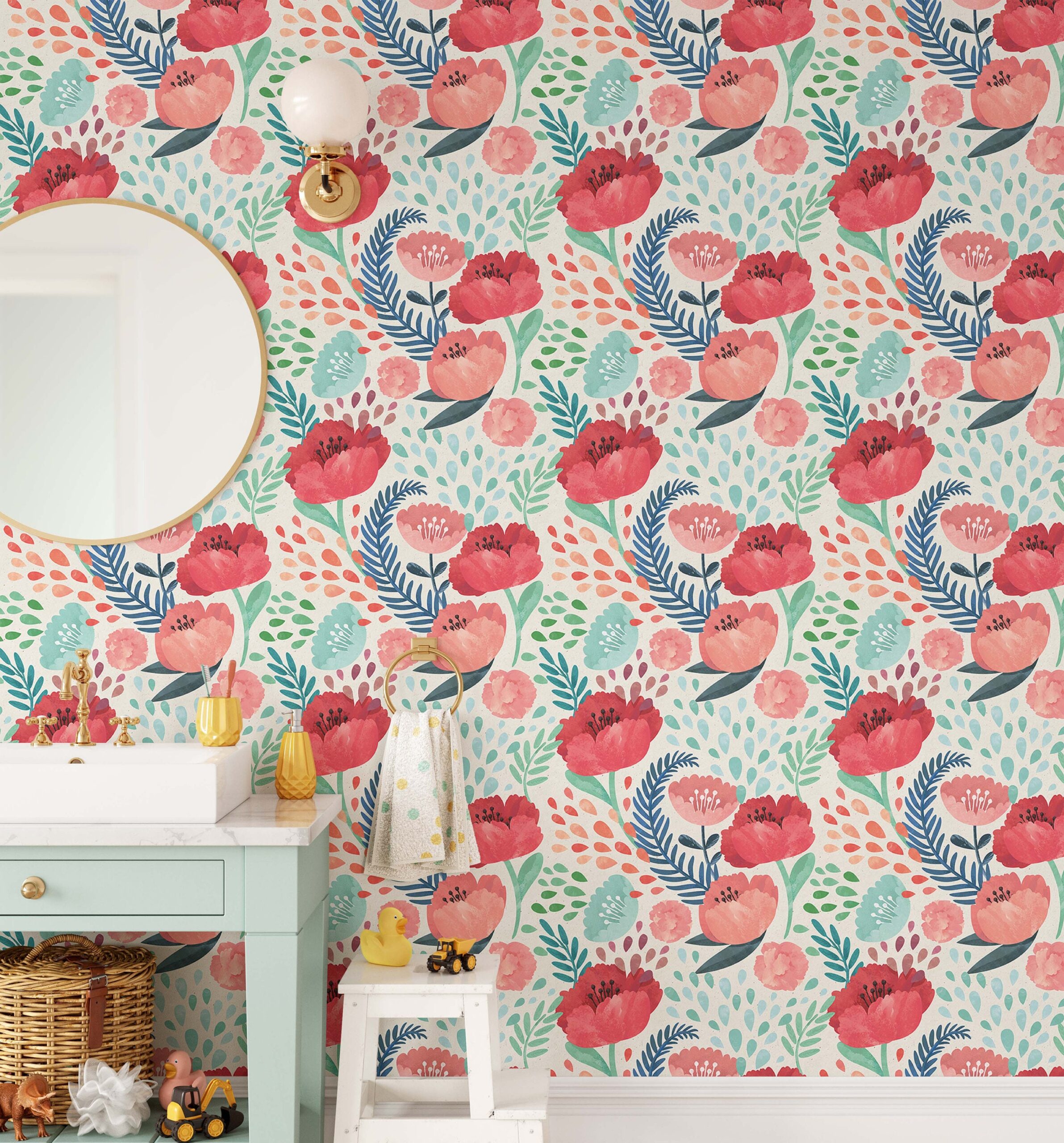 The fabric version of these red floral wallpaper wall decals can be repositioned up to 10 times without losing adhesion. Additionally, it leaves zero sticky residue when removed — making it ideal for rental spaces and kids’ rooms.