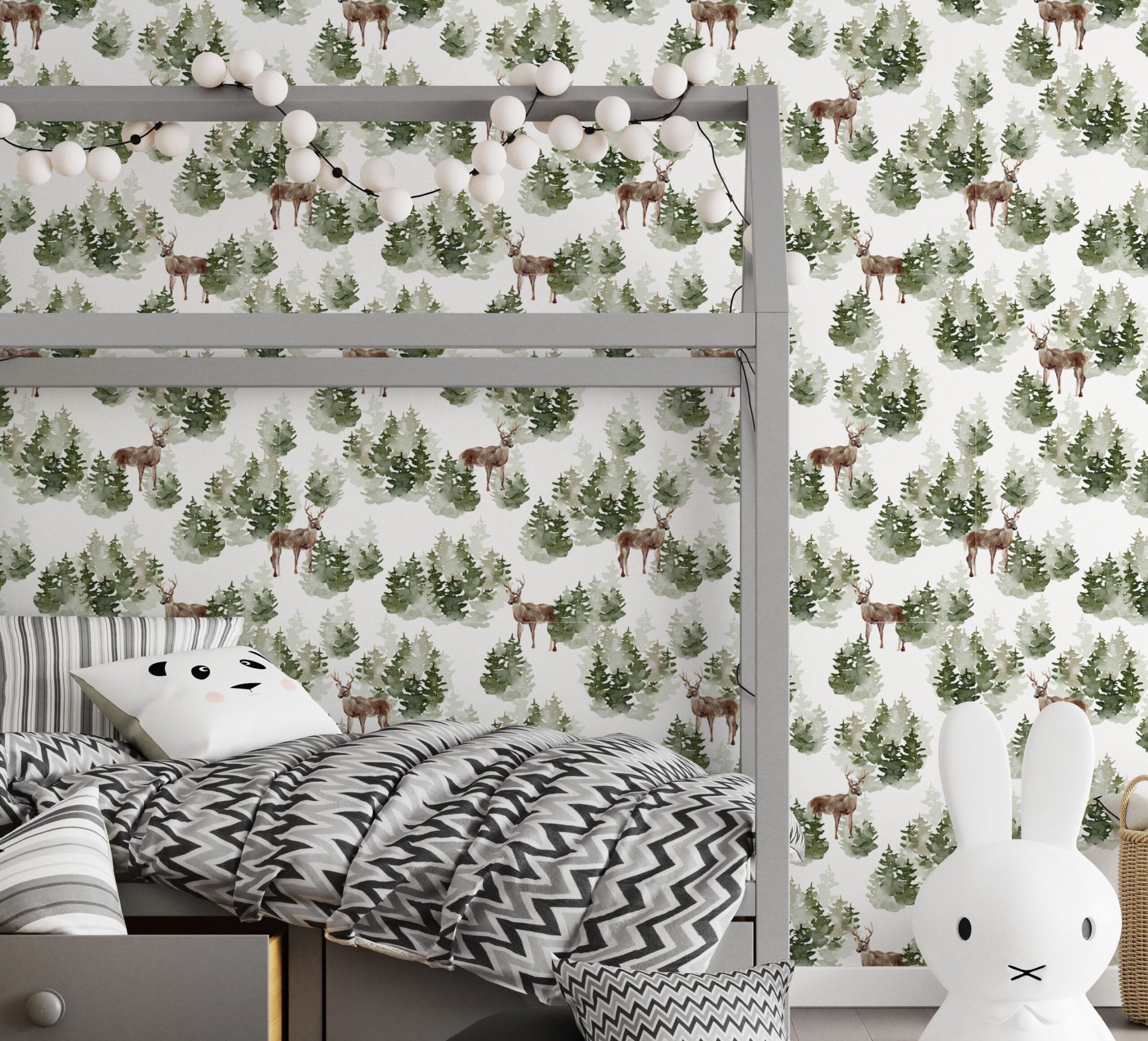 Removable Peel and Stick Watercolor Pine Tree Forest Woodland Deer Nursery Mural Decals