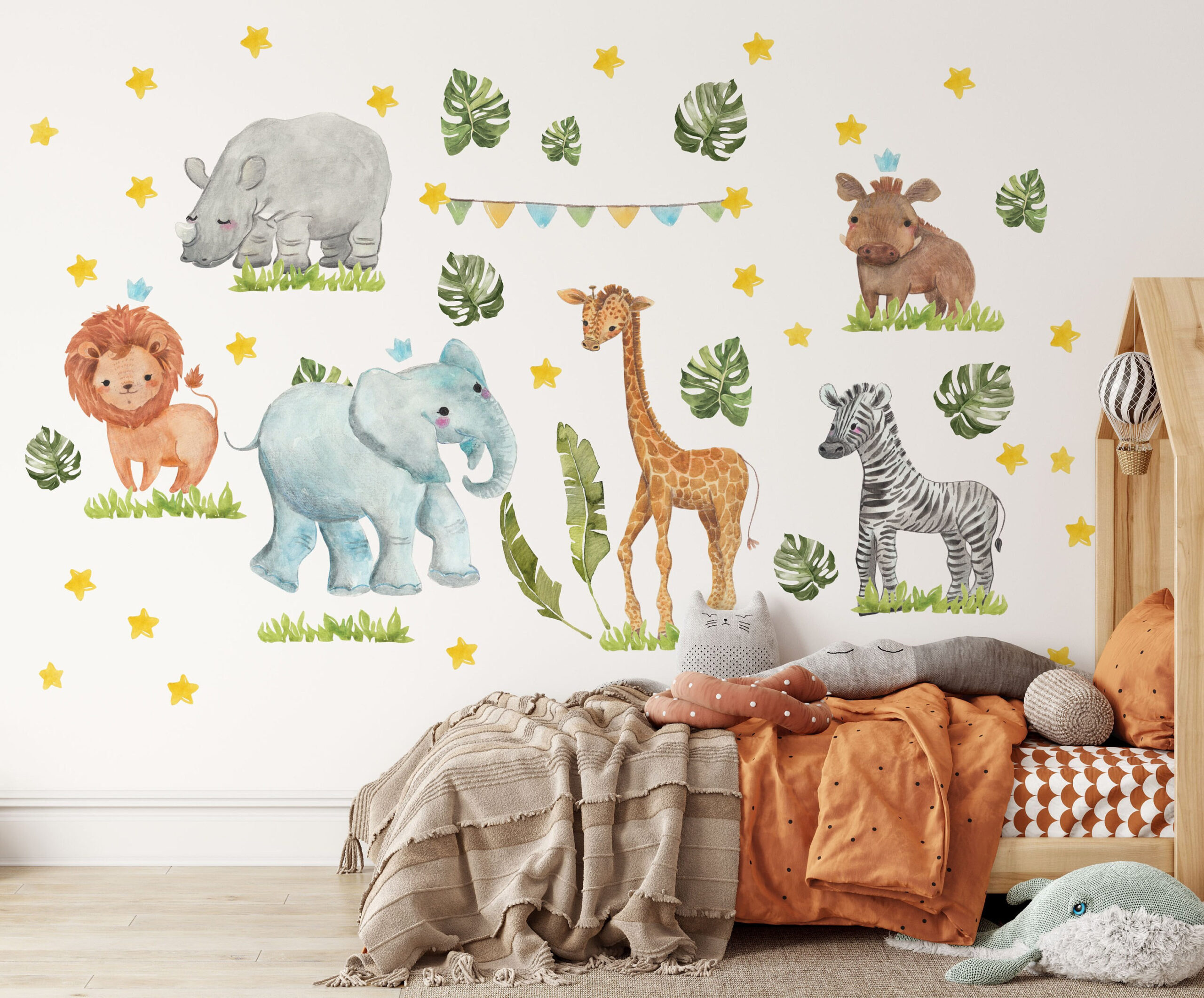 * 6 Decals with baby animals: Giraffe, elephant, Zebra, lion, warthog and hippopotamus