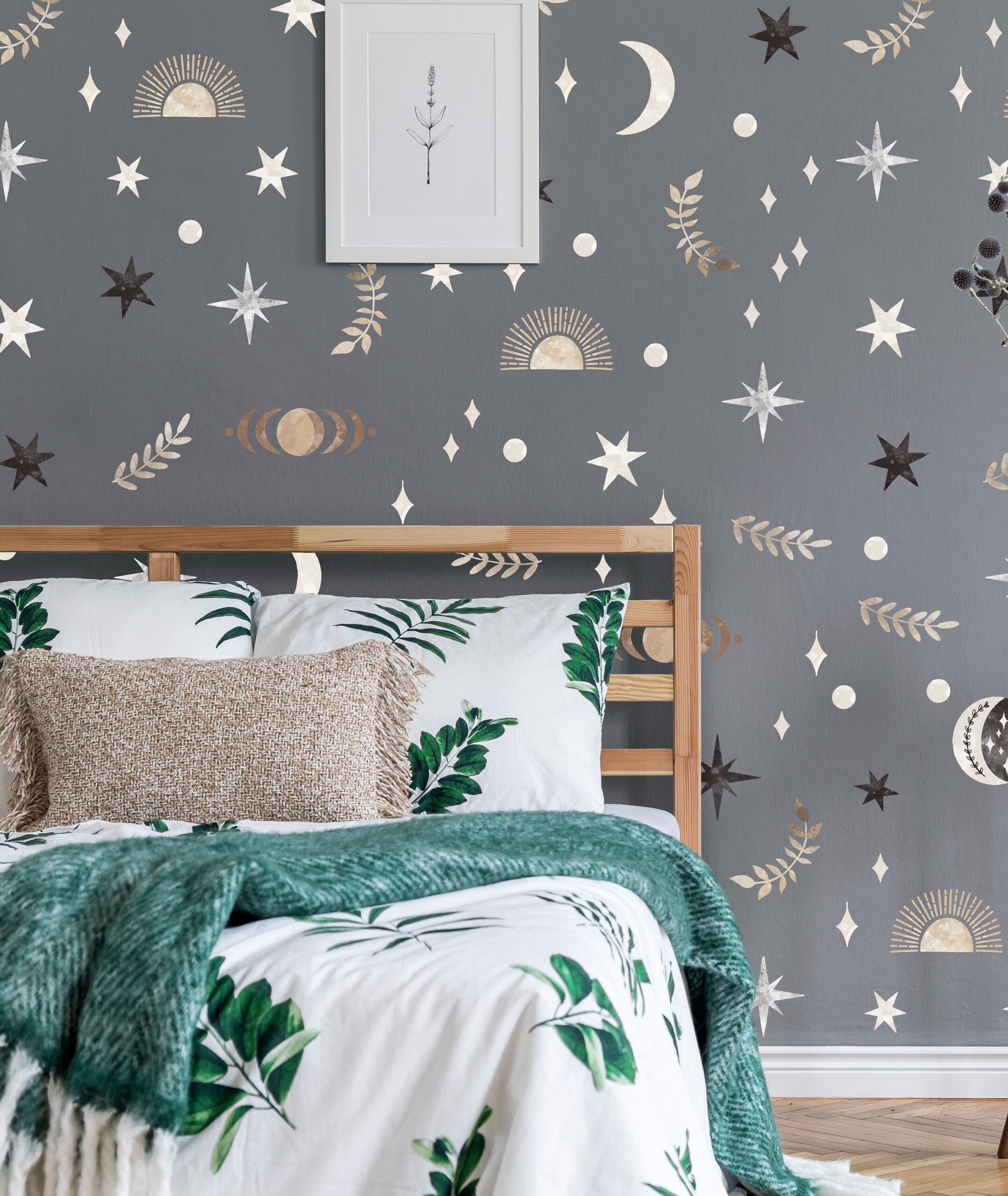 Star Moon Boho Wall Decals Sun Stickers Nursery Decor Magic Greenery Leaves Kids Room, D037
