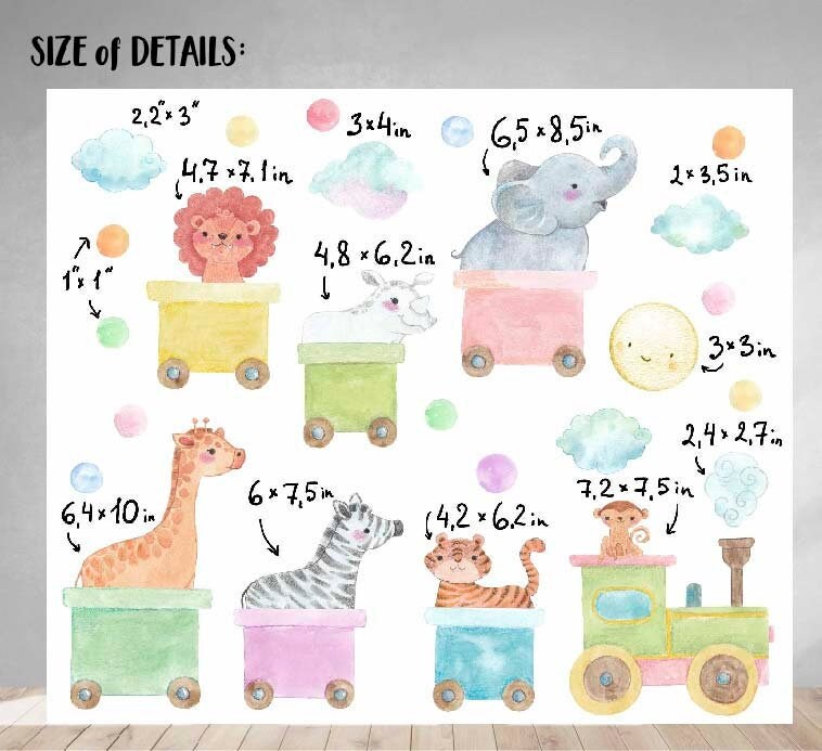 ♥ DETAILS:* 1 Train with 6 vans Decals with 7 animals: Giraffe, Elephant, Zebra, Lion, Rhino, Monkey and Tiger* 5 Clouds* 12 color Dots* 1 Sun