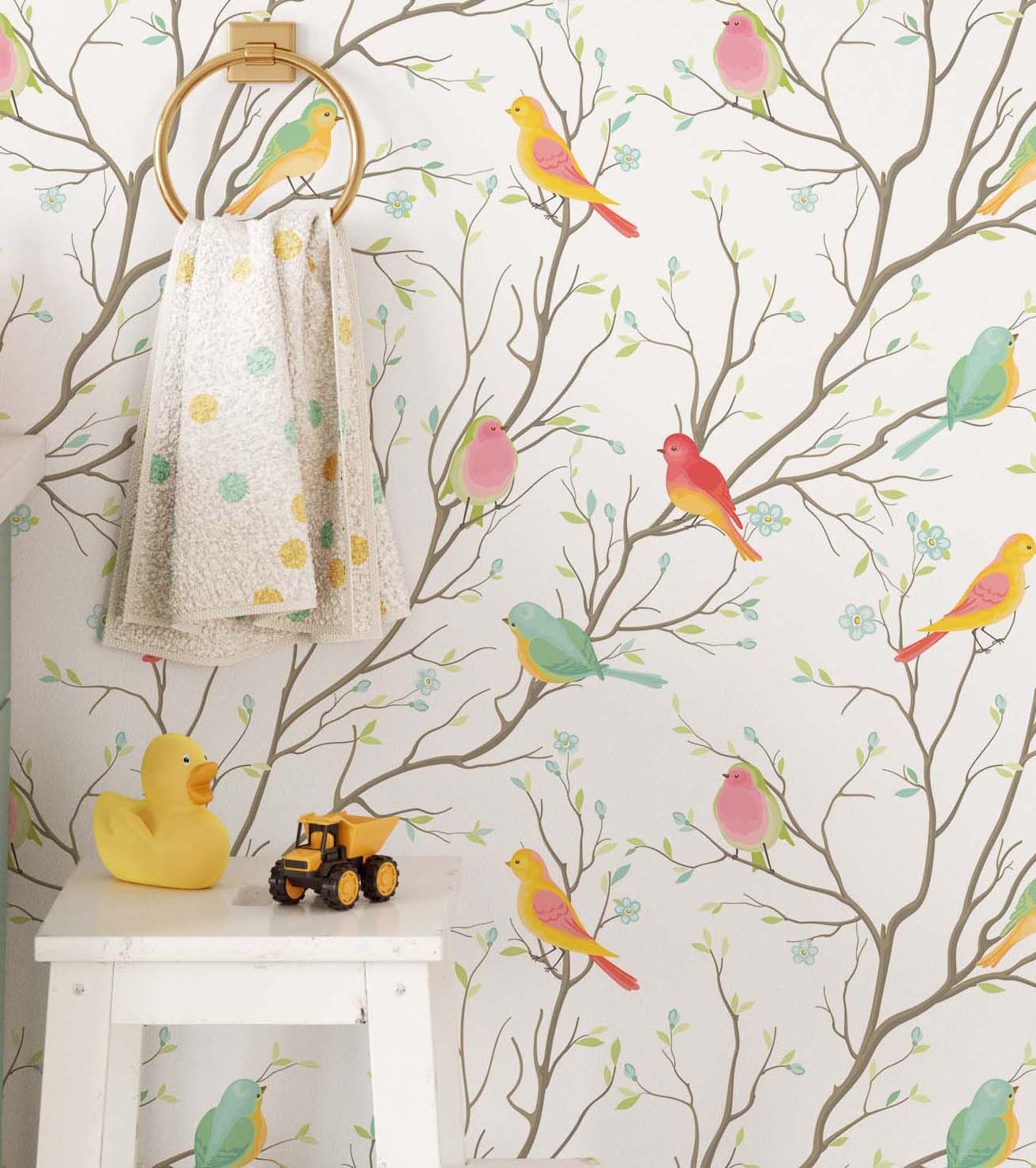 Trees and Birds Wallpaper Scandinavian Peel and Stick Colorful Removable Self Adhesive Botanical Mural Home Decor Wall Art Greenery