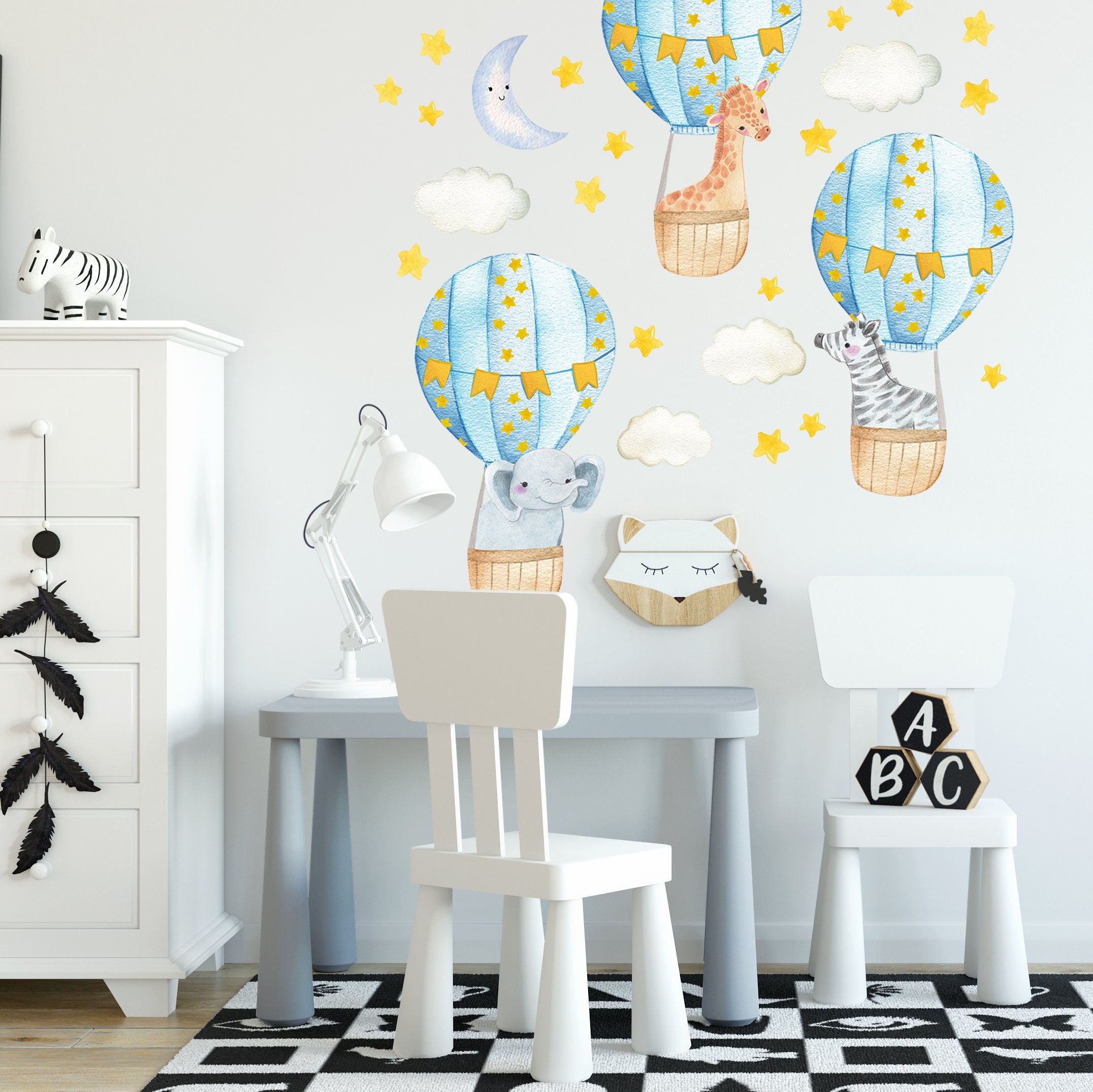 Hot Air Balloons Wall Decals, Moon and Stars Wall Stickers, Air Balloon Nursery Decor, Safari Animals, Watercolor Clouds Wall Decals, Night