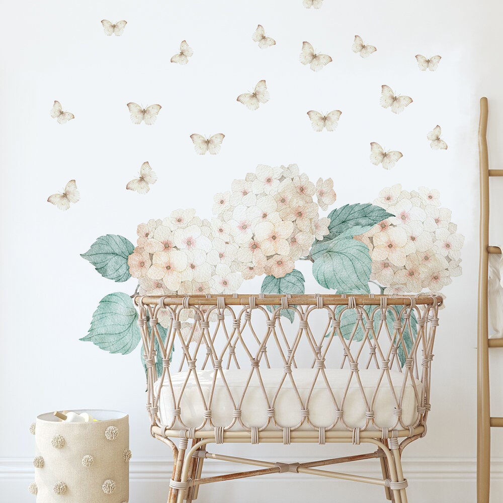 Hydrangea Flowers Wall Stickers Neutral Colors Nursery Decals Butterfly Watercolor Pink Beige Room decor Girls Tender Boho Bathroom