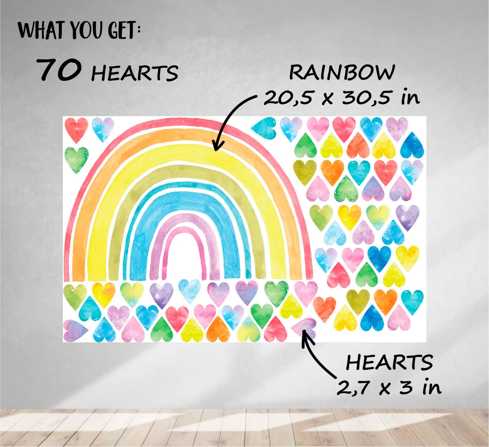 - 1 Beautiful Watercolor Rainbow 20,5x 30,5 in + 70 multicolored watercolor hearts 2,7×3 in