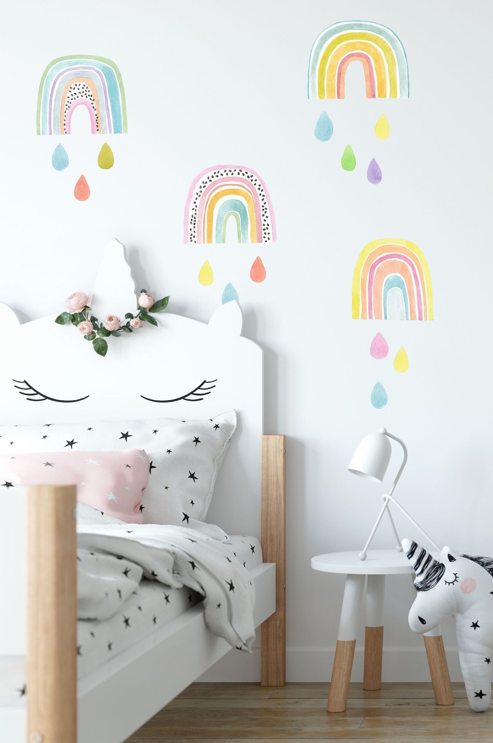 Brighten your little one’s room with this charming set of watercolor rainbow wall decals and matching raindrops. The soft, hand-painted look adds a touch of magic to nurseries, playrooms, or any cozy corner that needs a splash of color.