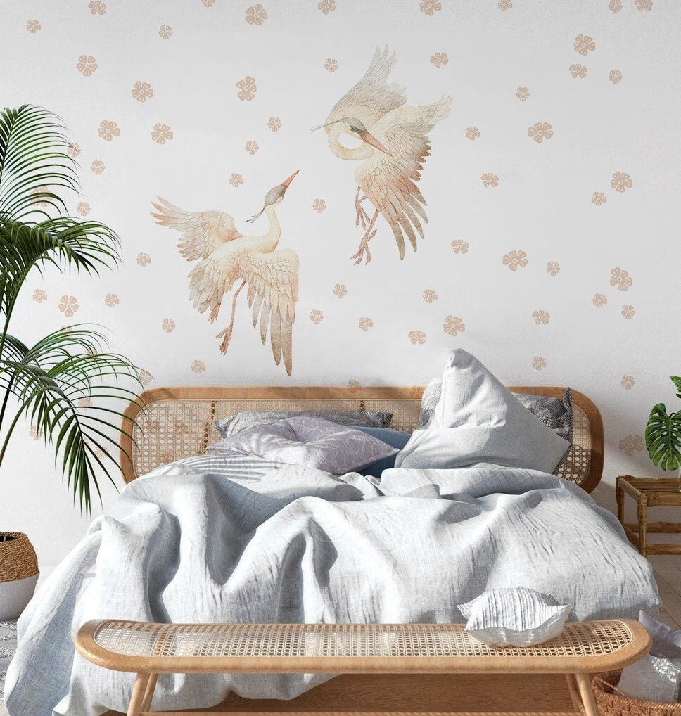 Stork Wall Stickers Heron Butterfly Watercolor Nursery Pink Beige Decals Girls Tender Boho Bathroom