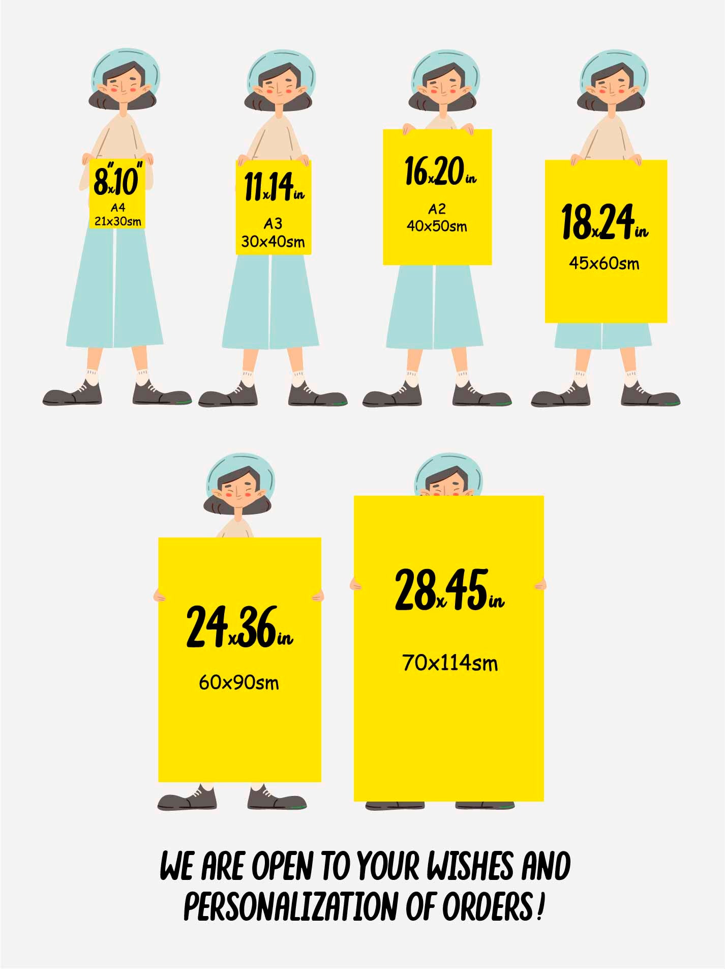 8"x10", 11"x14", 16"x20", 18"x24", 24"x36", 28"x40", 8"x10" black frame, 8"x10" white frame, 11"x14" black frame, 11"x14" white frame, 16"x20" black frame, 16"x20" white frame